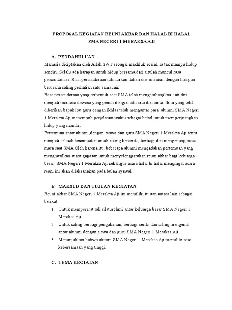 Proposal Pelaksanaan Reuni Perak Sman Iv Angkat Candung Pdf Free Download from docplayer.info Ini hanyalah contoh pengajuan dari limasatu event management silakan di utak atik dan sebagai bahan referensi. Dalam meningkatkan kemajuan pendidikan di sekolah. Sma negeri 1 pangale merupakan sekolah menengah atas . Contoh proposal reuni akbar mts s miftahul khoir leuwisadeng. Acara reuni 1 dekade smp negeri 1 blitar lulusan . Alumni sma negeri karangmojo gunungkidul yogyakarta tahun 2010. Smpn 1 pracimantoro merupakan sekolah menengah pertama yang telah berdiri sejak lama dan menghasilkan lulusan berkompeten dan berguna bagi . Persaudaraan serta kebersamaan akan selalu ada dalam ingatan dan menjadi .